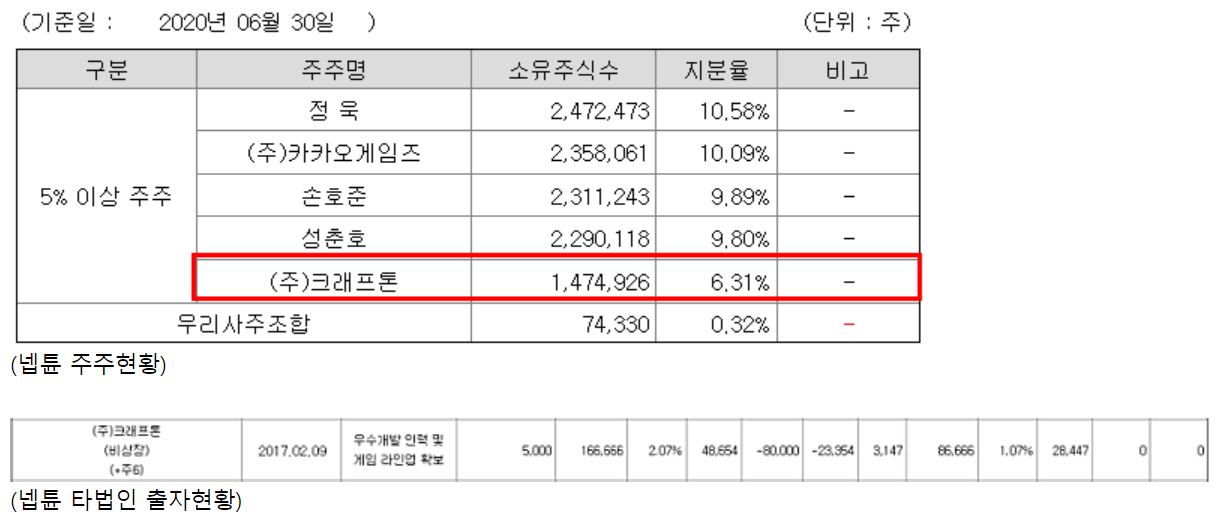 크래프톤 지분 1.07%(86,666주)보유하고 있으며, 또한 크래프톤 역시 넵튠의 주식을 6월30일 기준 6%를 지니고 있어 관계가 돈독합니다.
