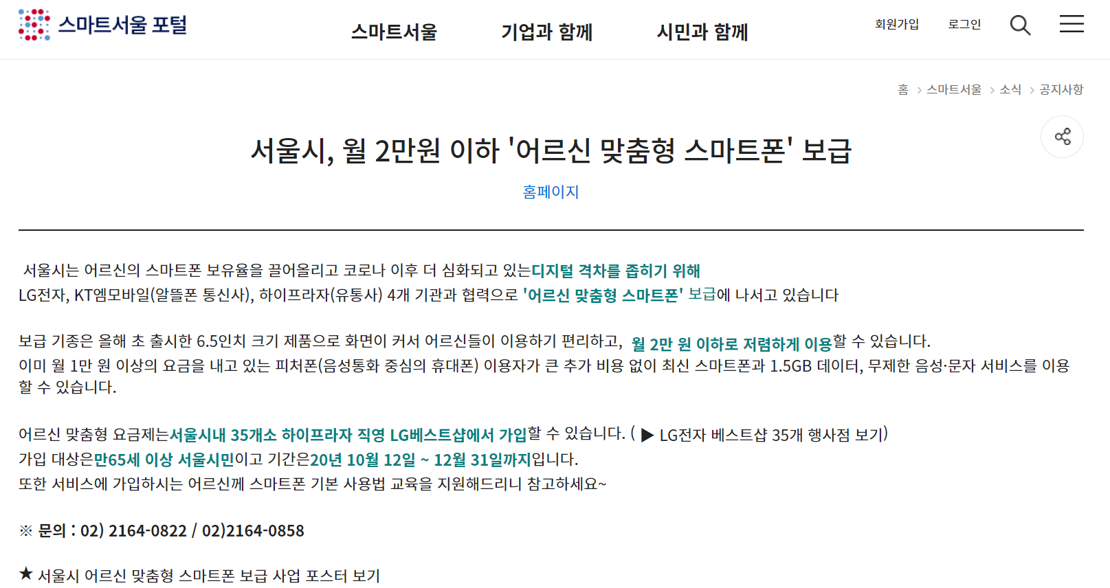 어르신 맞춤형 요금제 가입은 서울시내 35개소 하이프라자 직영 LG베스트샵에서 가능하며