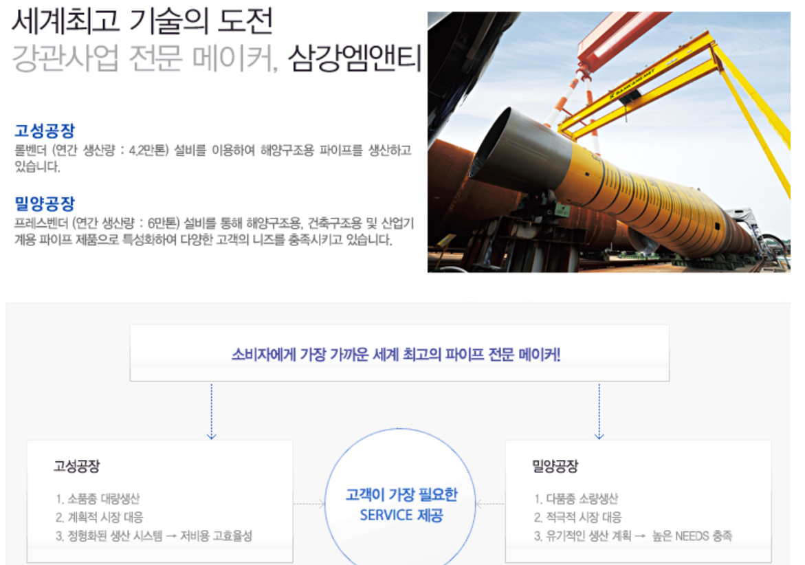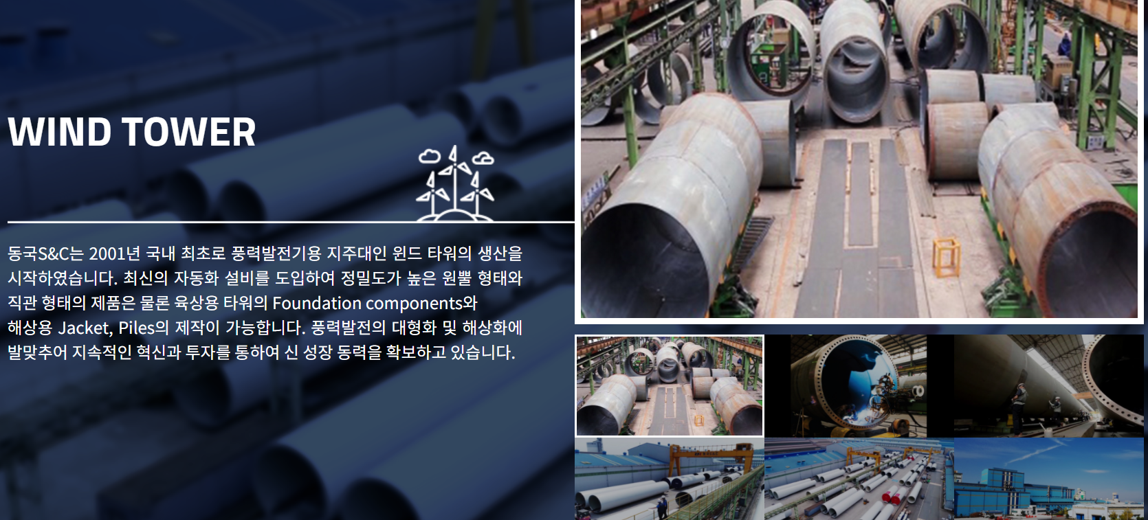선박 블록 및 해양플랜트 후육강관 제조업체로 주 매출처는 삼성중공업이 있으며, 해상풍력단지를 위한 하부구조물을 잘 만드는 회사로도 익히 유명합니다.