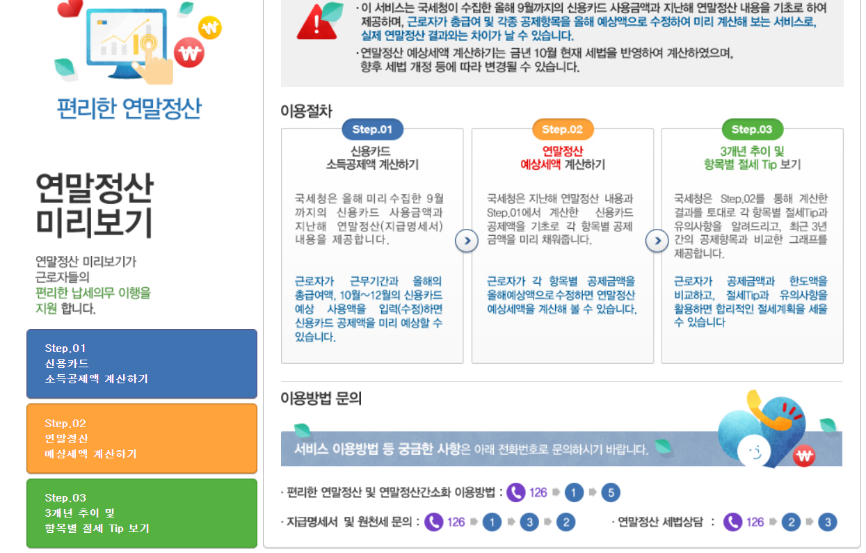 연말정산 미리보기는 1월~9월분 사용한 내역들을 바탕으로 세액을 미리 계산하여 절세를 할 수 있도록 도와주는 서비스입니다.