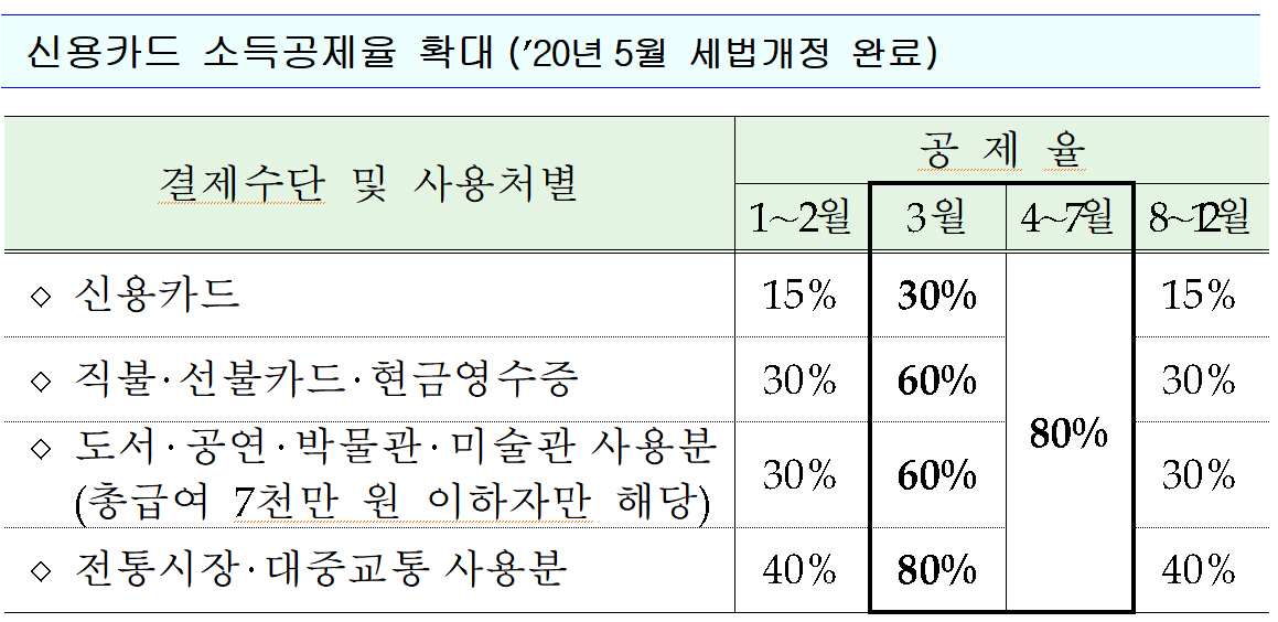 ⓒ국세청 2020년 신용카드 소득공제율을 보면 1~2월 사용은 15%, 3월 30%, 4~7월은 80%까지로 소비 진작 시즌에 잘 계획하여 활용했다면 연말정산이 두렵지 않겠네요.