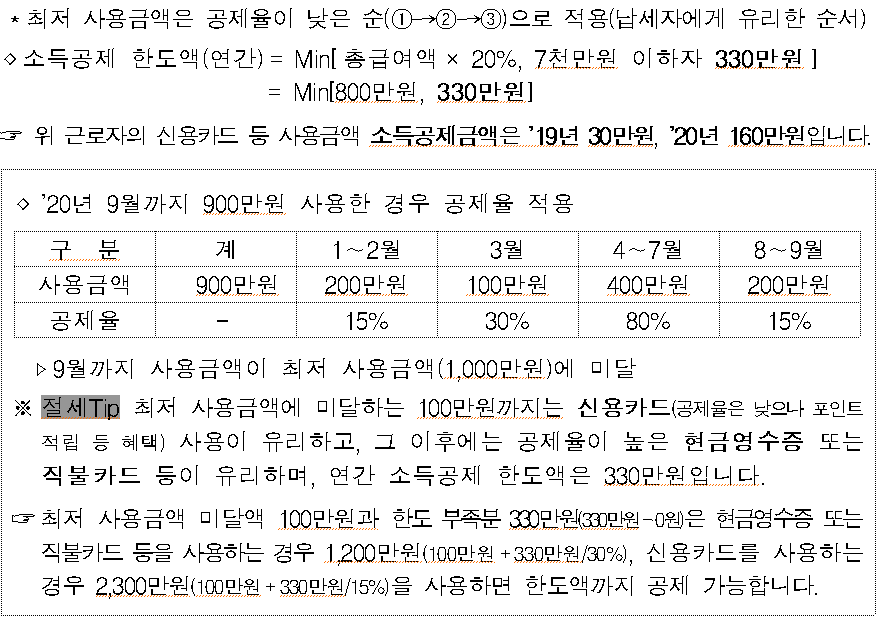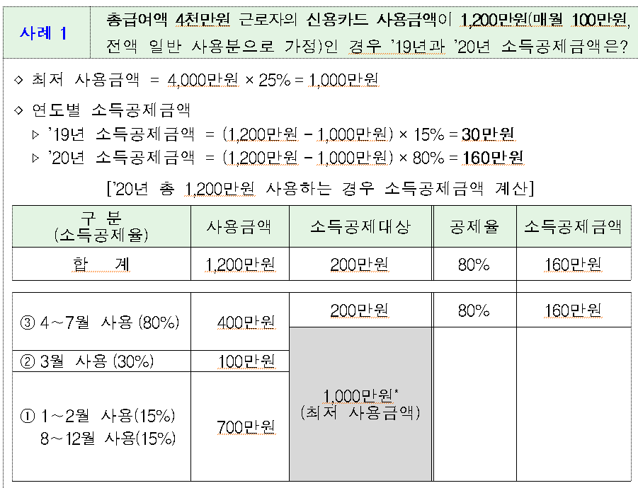 이처럼 늘어난 소득공제율에 따라 예를 들어, 총 급여 4,000만 원 근로자가 매월 100만 원씩 신용카드를 사용한 경우(전액 일반 사용분으로 가정) ’ 20년 귀속 신용카드 소득공제금액은 160만 원으로 ’ 19년 귀속에 비해 130만 원가량 증가됩니다!