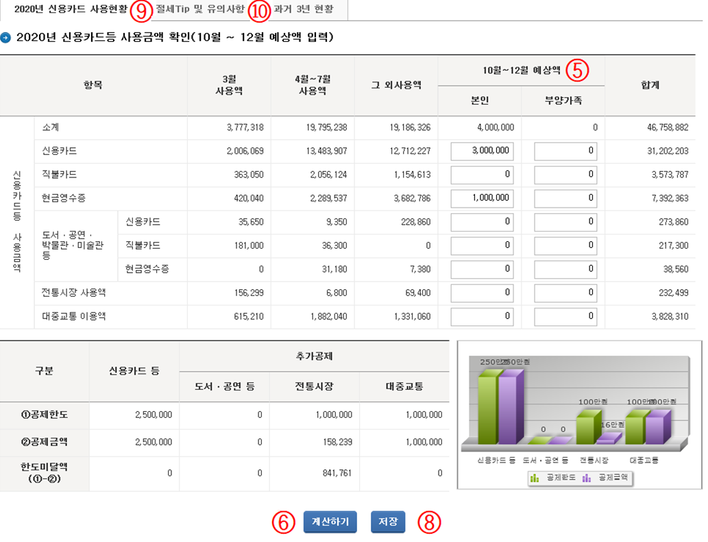 근로자가 결제수단 및 사용처별로 10월∼12월 사용(예정) 금액과 총급여액을 입력하면 공제금액과 예상세액이 자동 계산됩니다.
