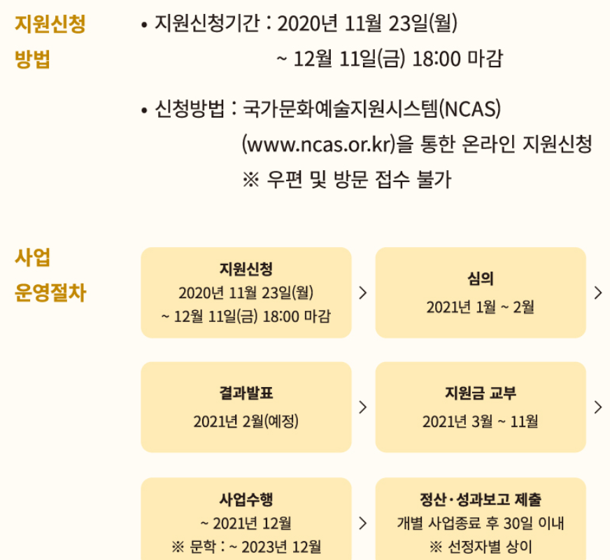 ▶신청방법 : 국가문화예술지원시스템(NCAS)(www.ncas.or.kr)을 통한 온라인 지원신청