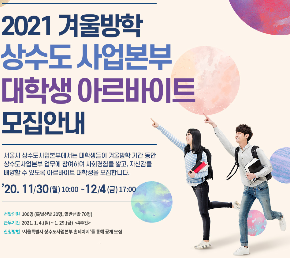 안녕하세요. 서울시 상수도사업본부는 겨울방학을 맞아 서울의 수돗물 아리수의 생산부터 서비스까지 다양한 과정을 체험하고 사회경험을 쌓을 대학생 아르바이트 100명을 모집합니다.
