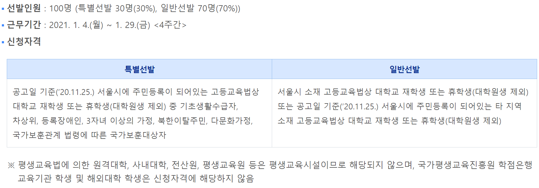 : 서울시 소재 고등교육법상 대학교 재학생 또는 휴학생(대학원생 제외) 또는 공고일 기준(’ 20.11.25.) 서울시에 주민등록이 되어있는 타 지역 소재 고등교육법상 대학교 재학생 또는 휴학생(대학원생 제외)