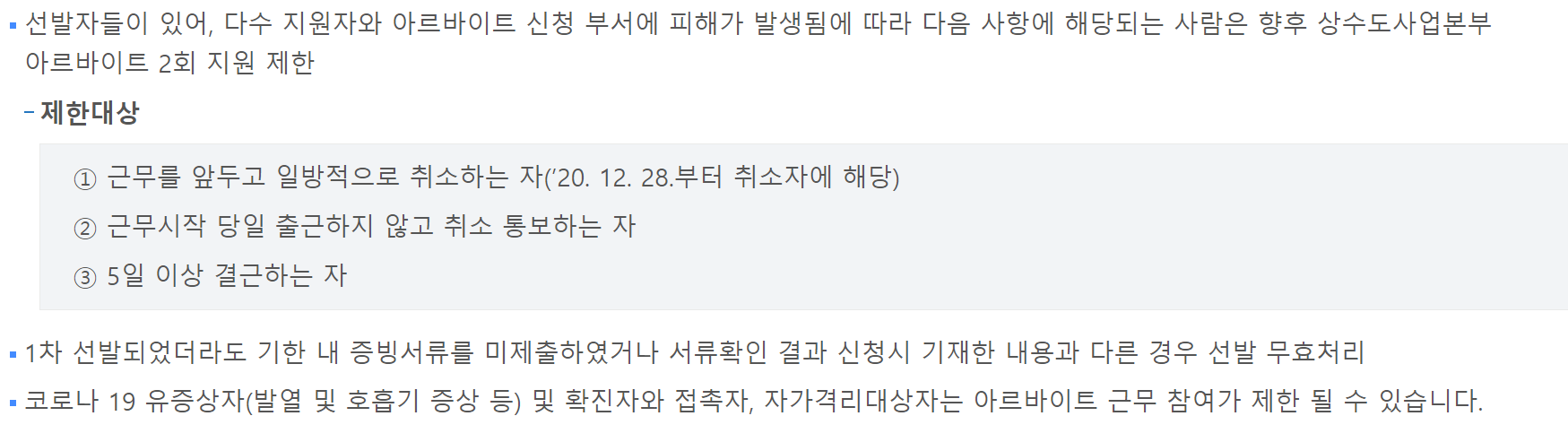 근무를 앞두고 일방적으로 취소하는 사람이나, 당일 출근하지 않거나, 5일 이상 결근시 다음 상수도사업본부에서 하는 사업에 신청이 2회 지원 제한 페널티가 있습니다.