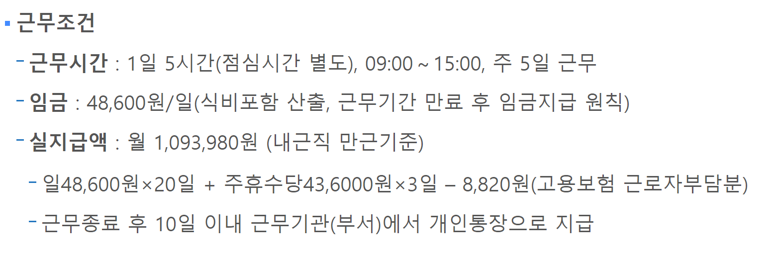 -근무시간 : 1일 5시간(점심시간 별도), 09:00~15:00, 주 5일 근무가 원칙이며