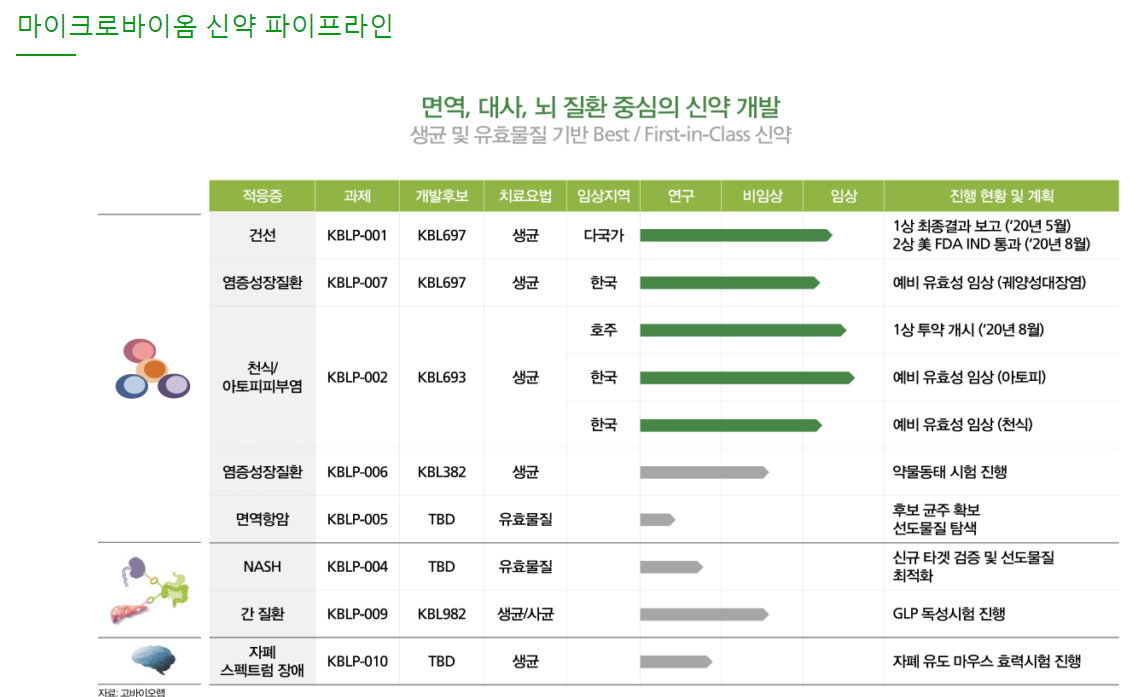 신약 부문 파이프라인으로는 KBLP-001(면역피부), KBLP-002(알레르기), KBLP-003(대사질환), KBLP-004(간질환) 치료제 등이 있습니다.