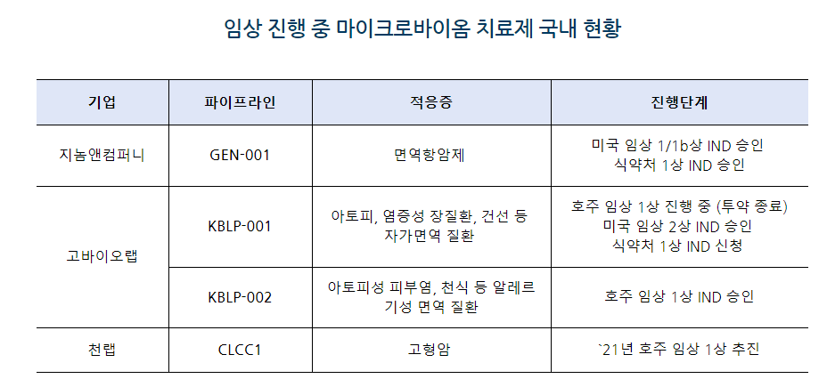현재 마이크로바이옴을 이용한 치료제는 미국과 영국 등에서 5개 품목이 임상 3상단계에 있습니다.