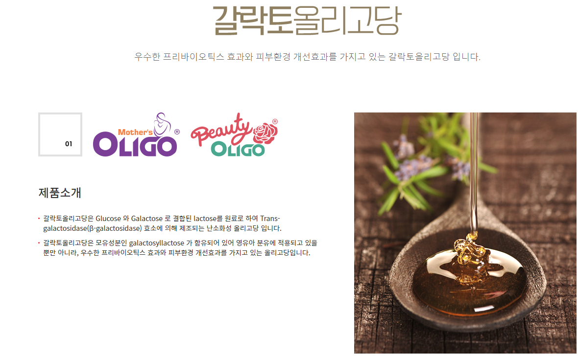 고순도의 액상 및 파우더 제형의 갈락토올리고당을 생산하며, 갈락토올리고당은 유산균에 필요한 영양소의 역할을 하기에 미생물과 연관이 매우 깊습니다.