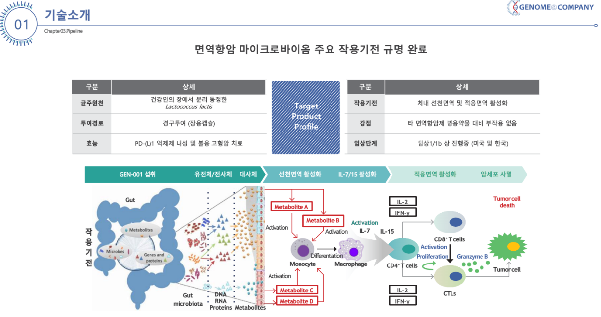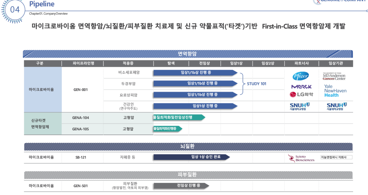 지놈앤컴퍼니는 인체 마이크로바이옴을 기반으로 질병을 예방하고 치료할 수 있는 생물학적 제제를 연구ㆍ개발하는 기업, 기술이전 등을 통한 사업화를 기본 모델로 하고 있습니다.