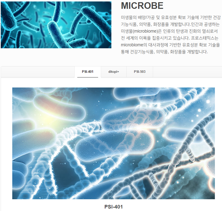 프로스테믹스는 미생물 유래 엑소즘, 나노베지클을 포함하여 세포외소포체를 연구 중이며, 중소벤처기업부가 주최한 기술개발 사업에서 장건강 기능성 식품 소재 개발 과제로 선정된 바 있습니다.