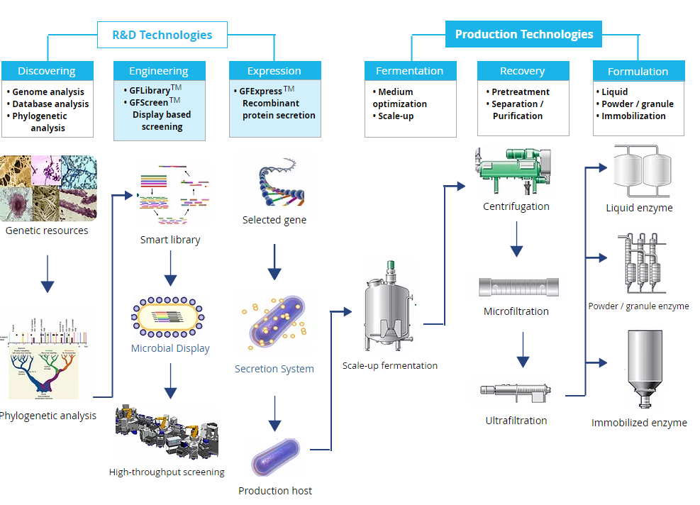 효소 개량에 효과적으로 적용되는 미생물 디스플레이 기술, 대량생산 가능한 분비 발현 기술 등을 보유하고 있으며