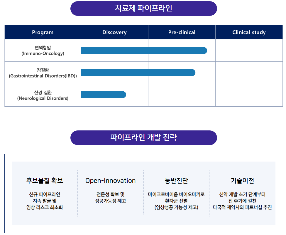 자회사 바이옴로직을 통해 미생물 유래 효소를 이용한 신약 개발하며 습성 노인성 황반변성, 염증성 장질환 , 대장암 치료제 등으로 파이프라인을 확대 전망하고 있습니다.