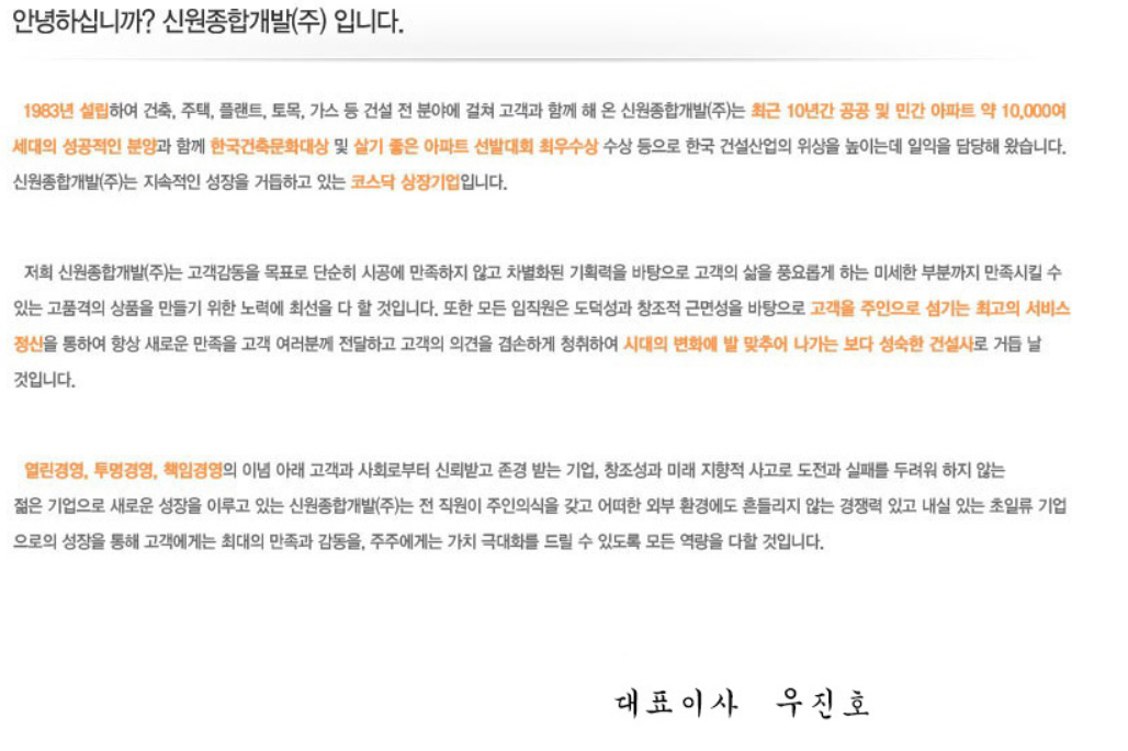 중소형 건설업체로 건축부문은 분양성과 수익성을 최우선 가치로 선별한 신원아침도시라는 브랜드의 아파트, 도시형 생활주택, 오피스텔 및 학교, 군관사 BTL 등의 사업 등을 수행하고 있습니다.