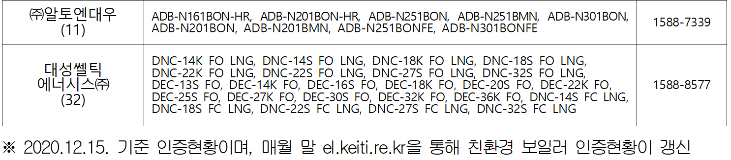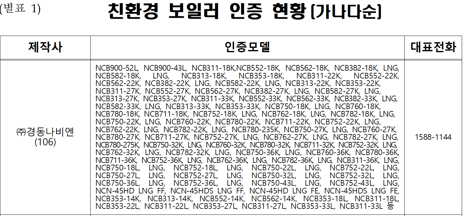 보조금이 지원되는 친환경 보일러는 환경부장관이 인증한 6개사 451종으로 (㈜경동나비엔 106종, ㈜귀뚜라미 114종, 대성쎌틱 에너시스㈜ 32종, 린나이코리아㈜ 184종, 롯데알루미늄(주)기공 사업본부 4종, ㈜알토엔 대우 11종)이 있습니다.