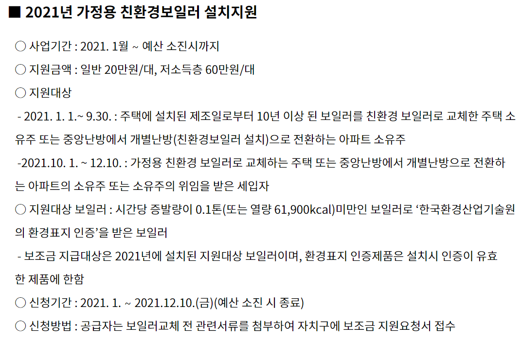 친환경 보일러 지원금 지급 사업기간은 2021. 1월 ∼ 예산 소진시까지이며 제조한 지 10년 이상 된 보일러를 친환경 보일러로 교체하려는 주택(단독, 다가구, 아파트, 연립, 다세대 등) 소유주가 대상입니다.