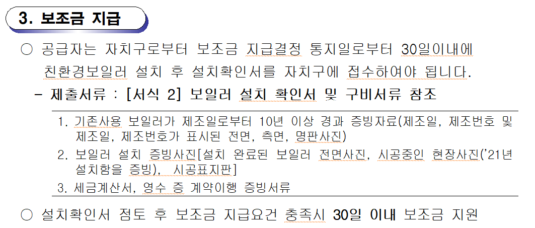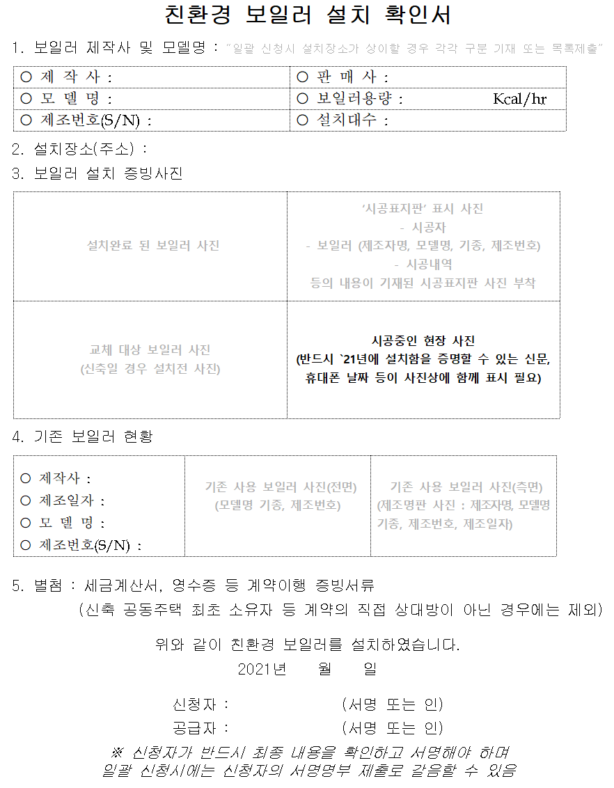 단, 친환경 보일러 보조금은 2021년도에 설치되는 보일러에 한하여 지원되며, 이전 설치된 보일러를 이월하여 신청 시 지원되지 않습니다.
