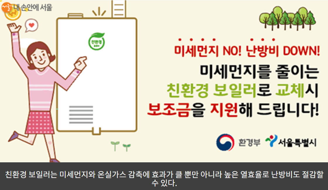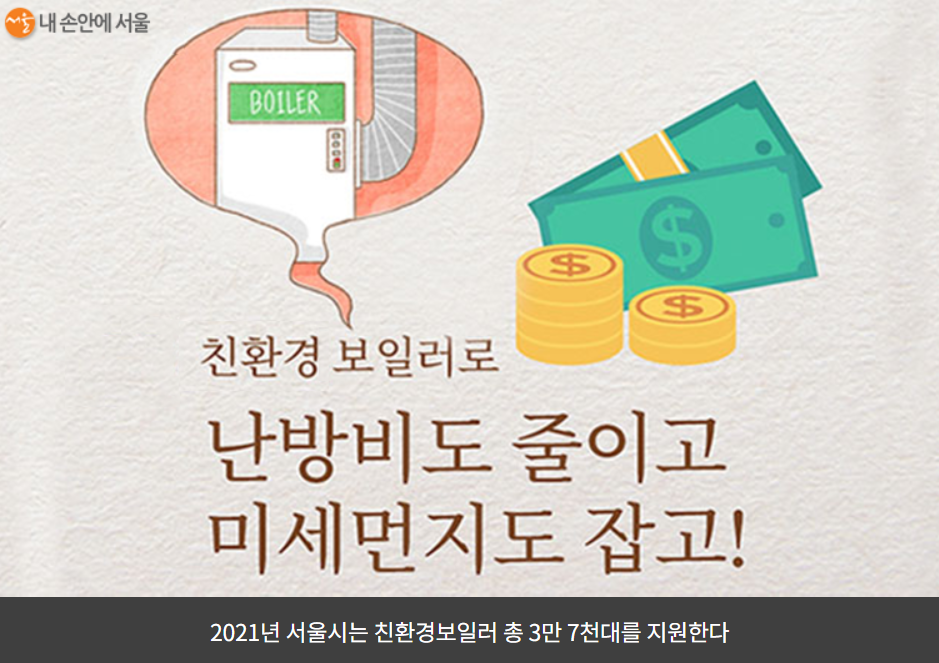안녕하세요. 서울시에서는 대기환경 개선을 위하여 가정용 친한경 보일러를 총 3만 7천대 보급할 계획입니다.