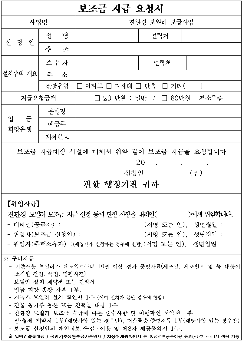 기존 노후 보일러를 친환경 보일러로 교체시 주택 소유주에 일반 20만 원, 저소득층 60만 원을 지원합니다.