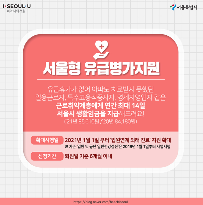 2021년도 서울시 유급병가지원은 일용근로자, 특수고용직종사자, 영세자영업자 같은 근로취약계층에게 연간 최대 14일 서울시 생활임금을 지급합니다.