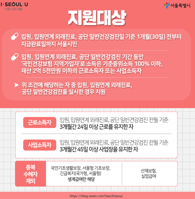 지원대상은 입원, 입원연계 외래진료, 공단 일반건강검진일 기준 1개월(30일) 전부터 지급완료일까지 서울시민입니다.