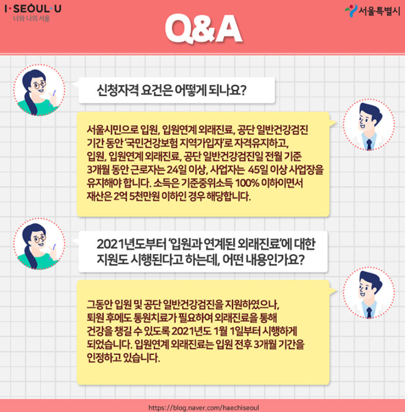 지원대상은 입원, 입원연계 외래진료, 공단 일반건강검진일 기준 1개월(30일) 전부터 지급완료일까지 서울시민입니다.