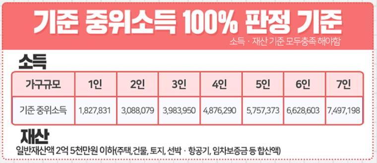 단, 기준 중위소득 100%(1인 가구의 경우 약 182만 원, 3인 가구 약 398만 원) 및 재산 기준을 충족해야 합니다.