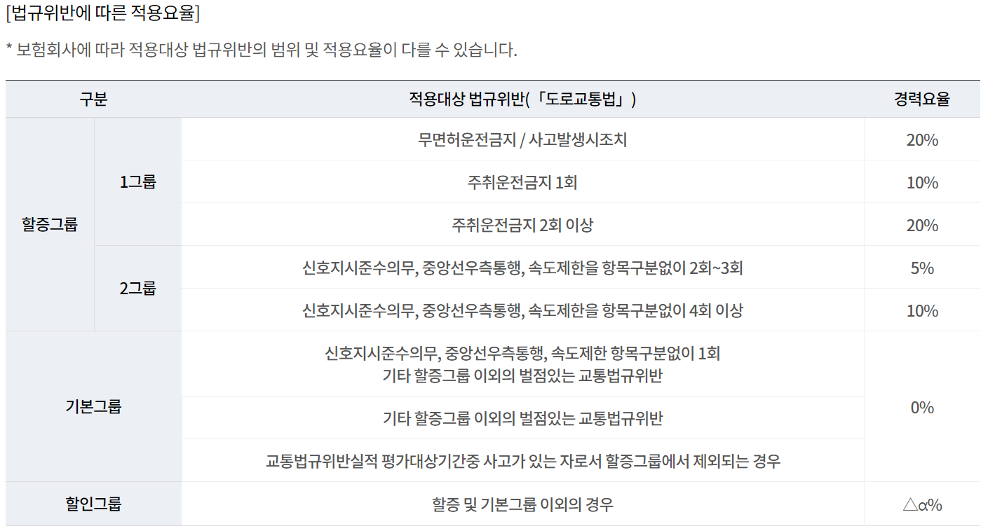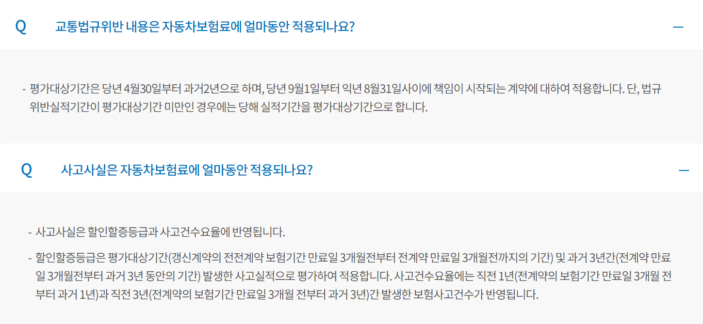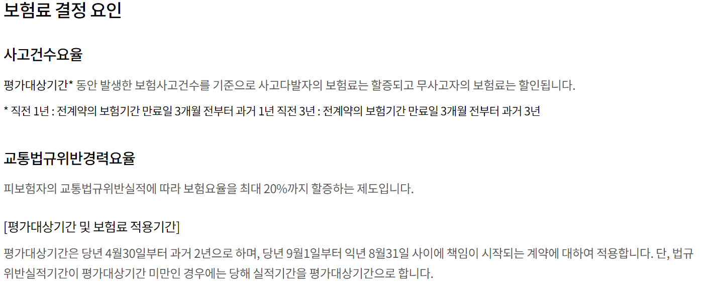 자동차보험료를 결정하는 사고 건수, 법규위반 건수, 할인·할증 등급, 연령, 가입경력, 갱신비용 산출방식 등을 자세히 볼 수 있습니다.