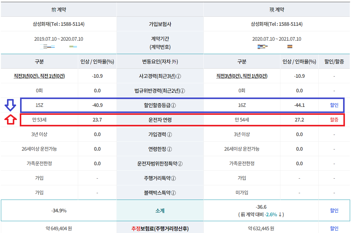할인할증등급 구간을 보면 15Z에서 16Z로 좋아짐에 따라 4% 추가 인하가 되었습니다.