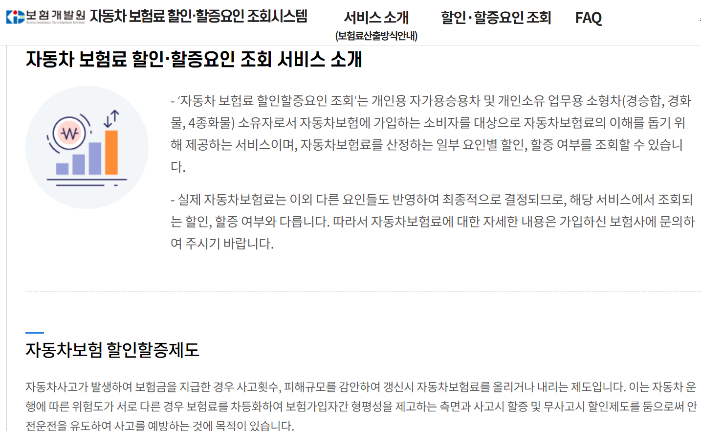 자동차보험 할인할증 조회시스템은 개인용 자가용승용차 및 개인 소유 업무용 소형차(경승합, 경화물, 4종 화물) 소유자로서 자동차보험에 가입한 경우 누구나 확인 가능합니다.(바로가기)