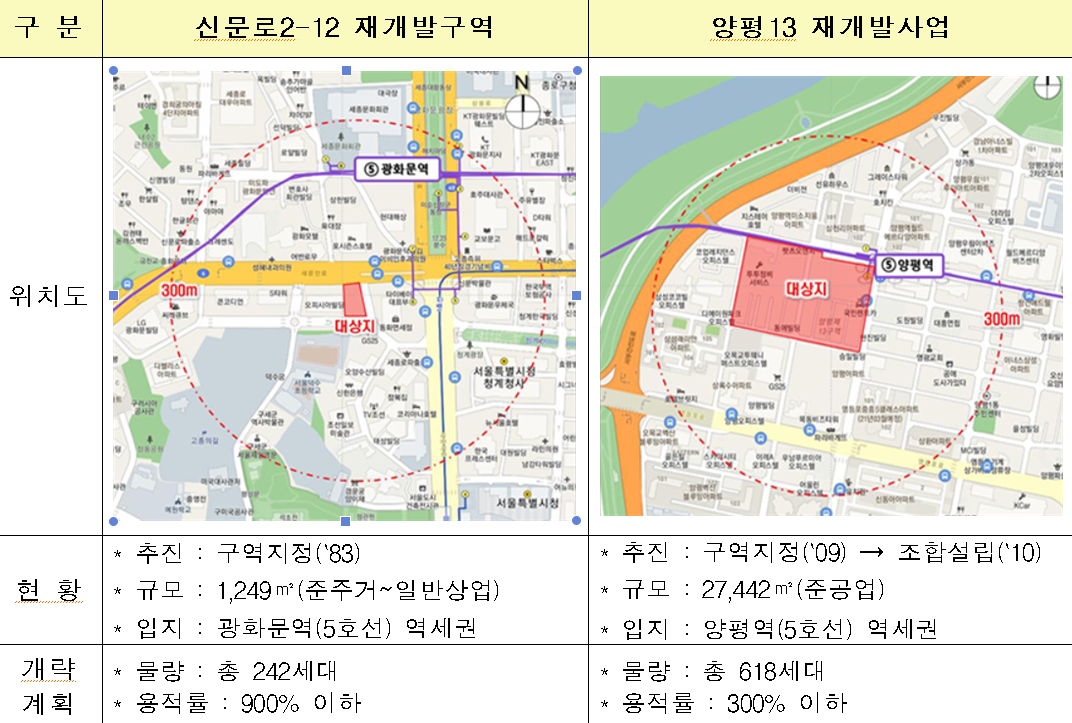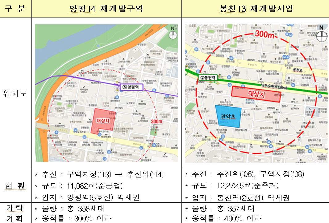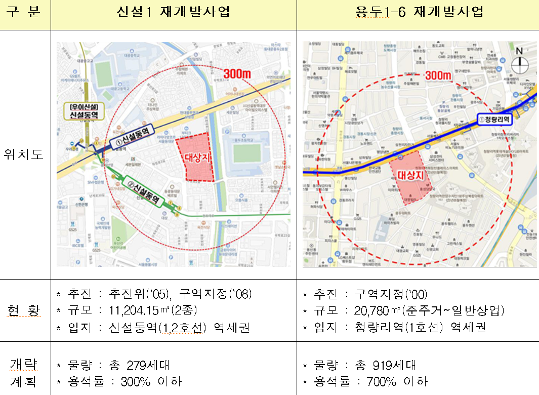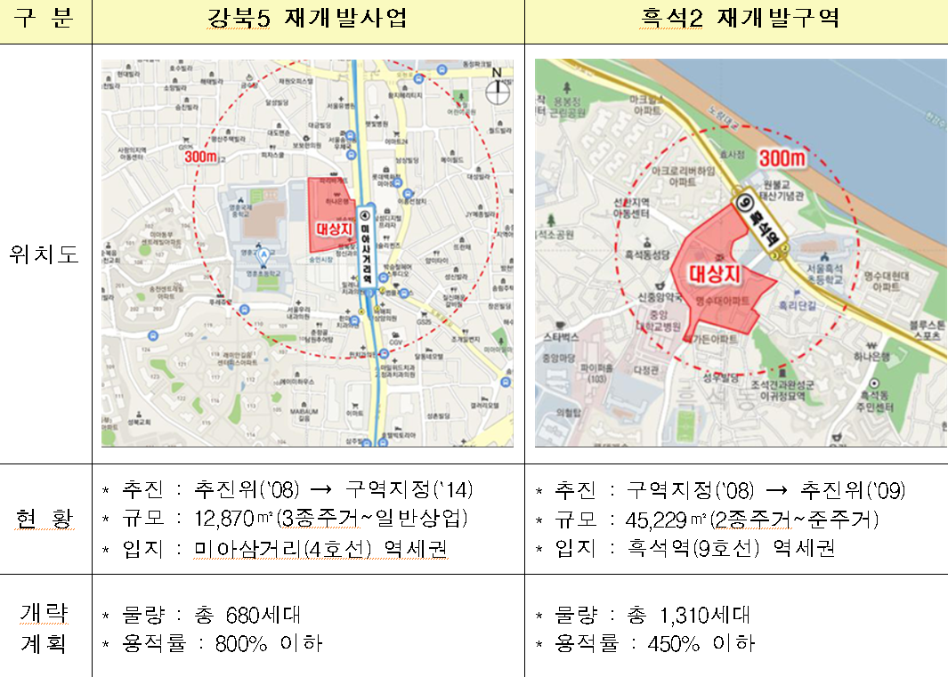 선정된 구역은 모두 역세권 주변에 위치한 기존 정비구역이며 그간 사업성 부족과 주민 간 갈등 등의 이유로 평균 10년 이상 사업이 정체되었던 곳들입니다.