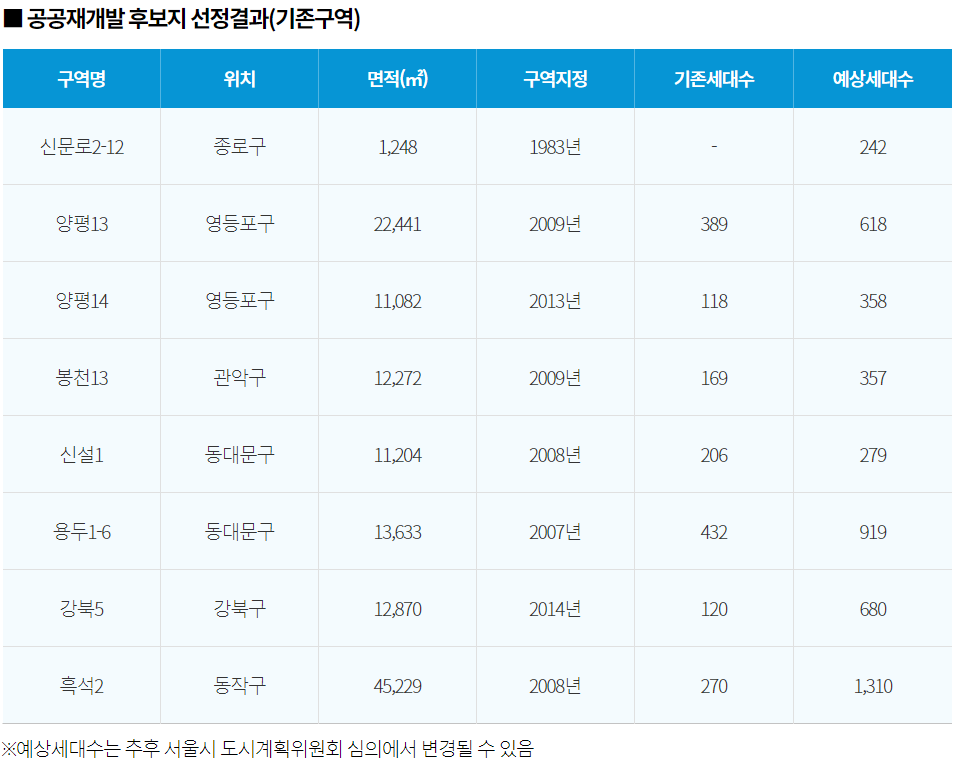 흑석 및 양평을 포함한 8곳은 앞으로 주민동의를 거쳐 LH와 SH가 공공시행자로 지정되며, 서울시는 공공재개발 특례가 적용된 정비계획을 수립할 방침입니다.