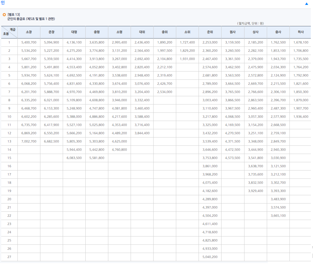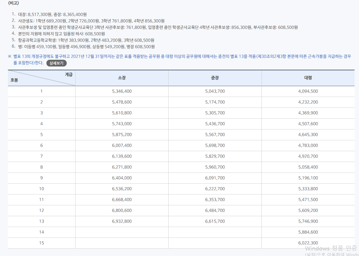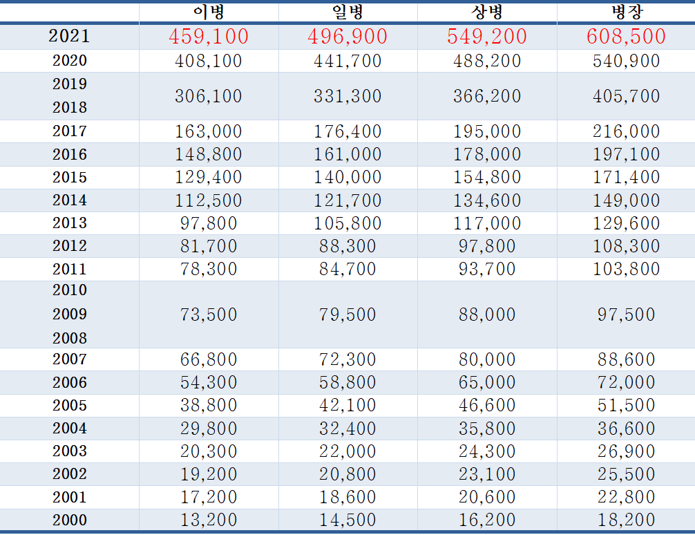 ▼2021년 직업군인 월급 표