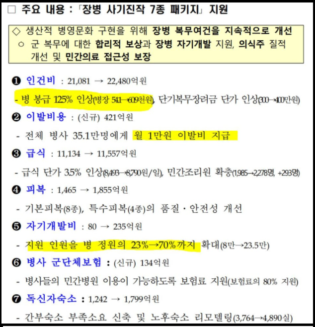 2021년 군인 월급은 125% 인상돼서 군장병 봉급이 소폭 오르고 월 1만 원 이발 비용 및 자기 계발 비도 23.5만 원까지 인상됐습니다.