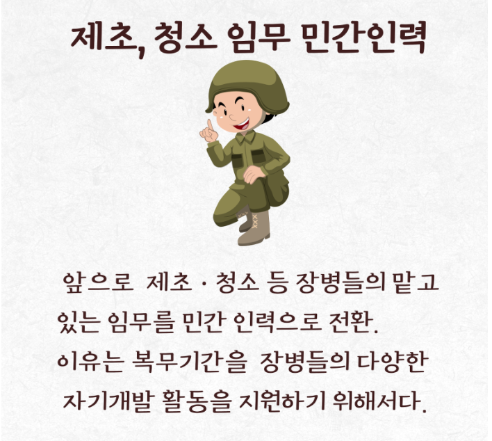 ⓒ병무청 이밖에도 동원훈련보상금도 3배가량 인상되며, 병사들이 하고 있는 임무 중에서 청소나, 제초 등의 일은 민간 인력으로 전환한다고 합니다.