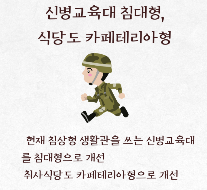 또한 현재 침상형 생활관을 사용하는 신병교육대를 침대로 개선하고, 식당을 카페 테리 아형으로 쾌적하게 바꾸고 이용할 수 있도록 할 예정입니다.