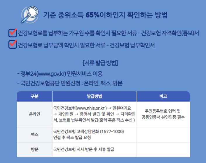 또한 기초생활수급자, 차상위계층, 기준 중위소득 65% 이하인 가구의 구성원이어야 합니다.