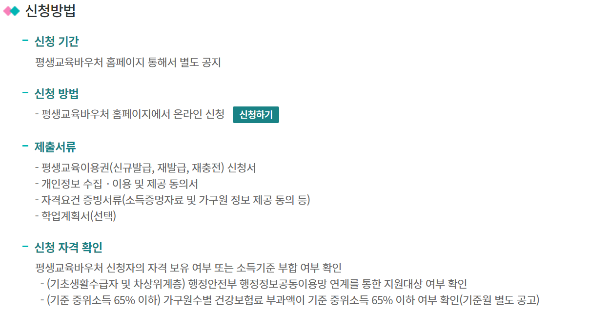 수급자가 아니더라도 중위소득만 충족한 성인의 경우 평생교육 바우처 신청을 할 수 있으니 건강보험료 납부부터 확인해서 꼭 신청할 수 있기를 바랍니다.