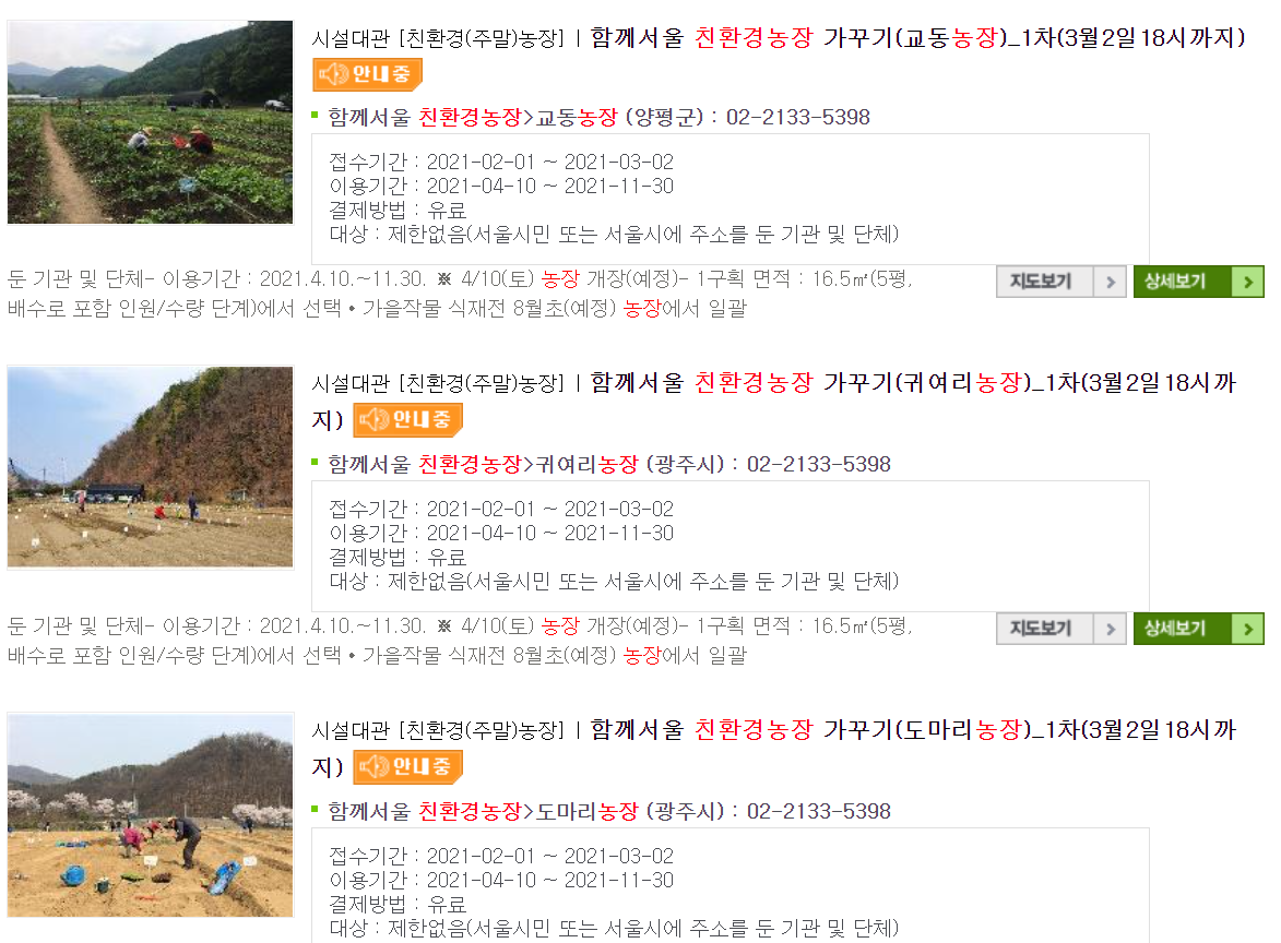 모집기간 : 2021. 2. 1.(월) 09:00 ~ 3. 19.(금) 18:00이며, 모집 후에 농장 이용기간은 4.10.~ 11.30까지 입니다.