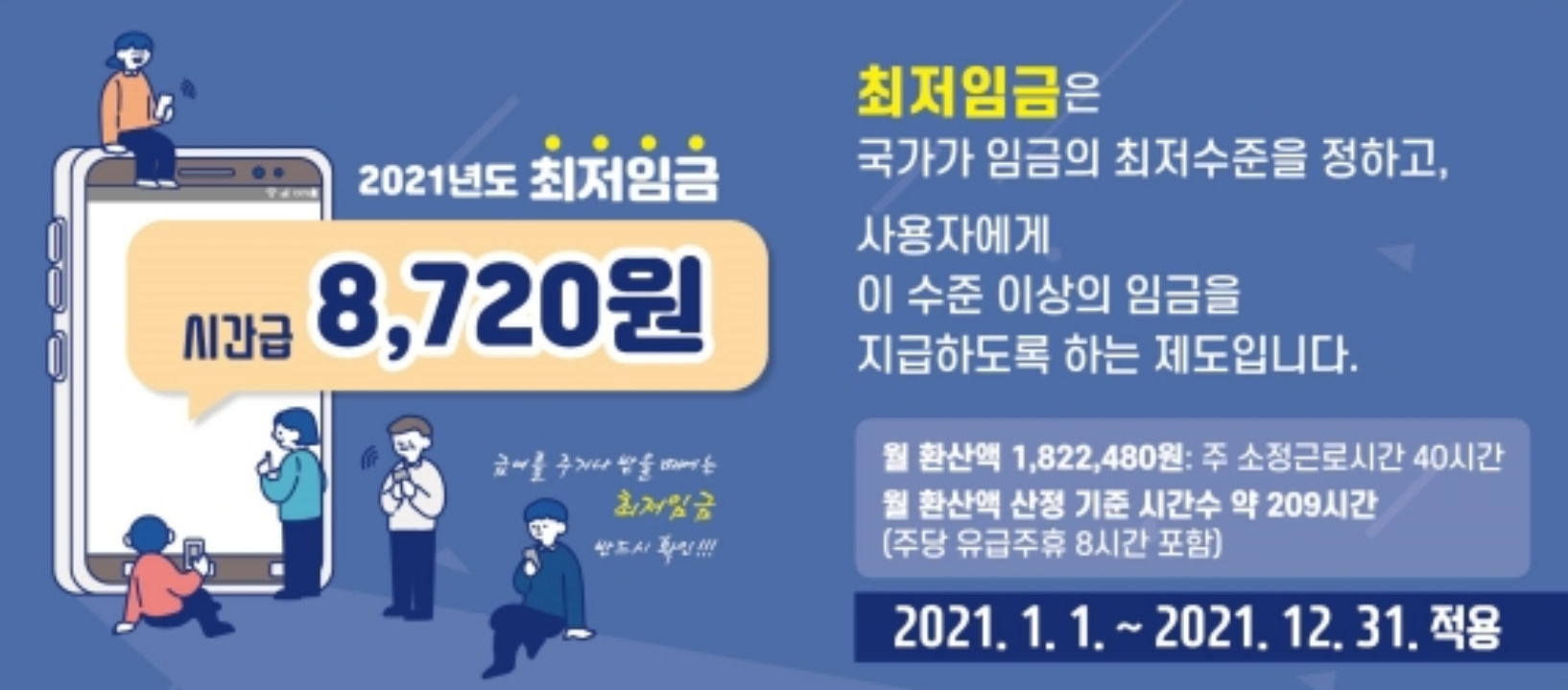 최저임금은 국가가 임금의 최저 수준을 보장하는 것으로 이번 최저임금은 21년 1월 1일~ 12월 31일까지 적용됩니다.