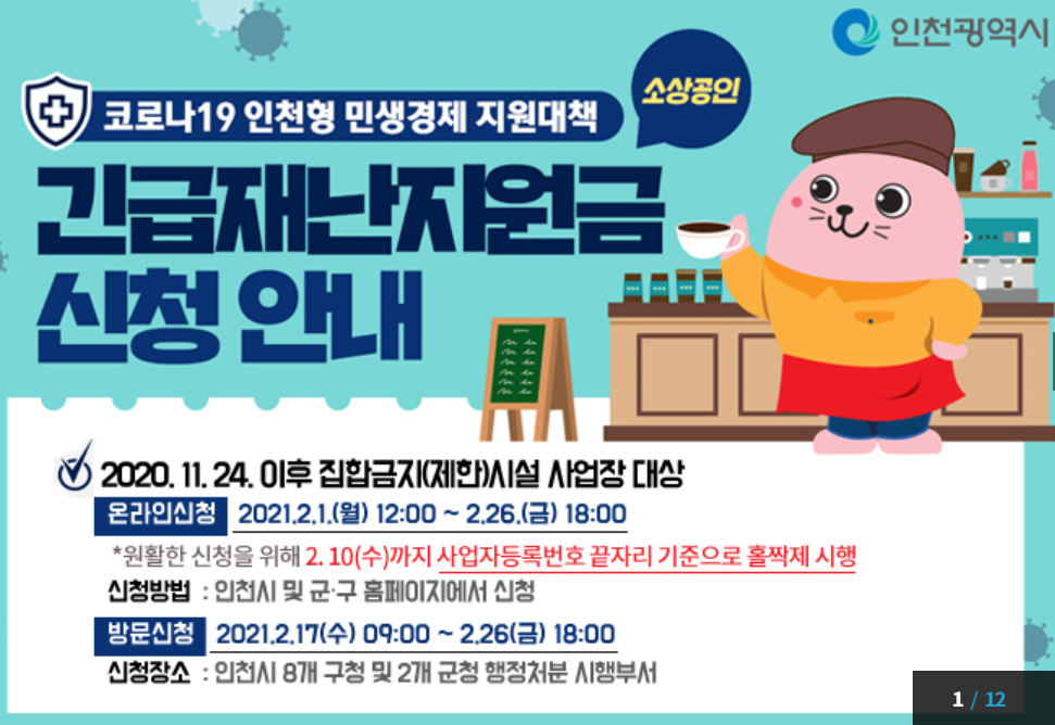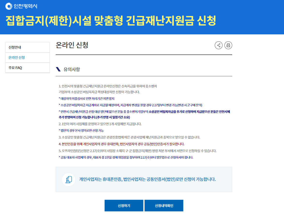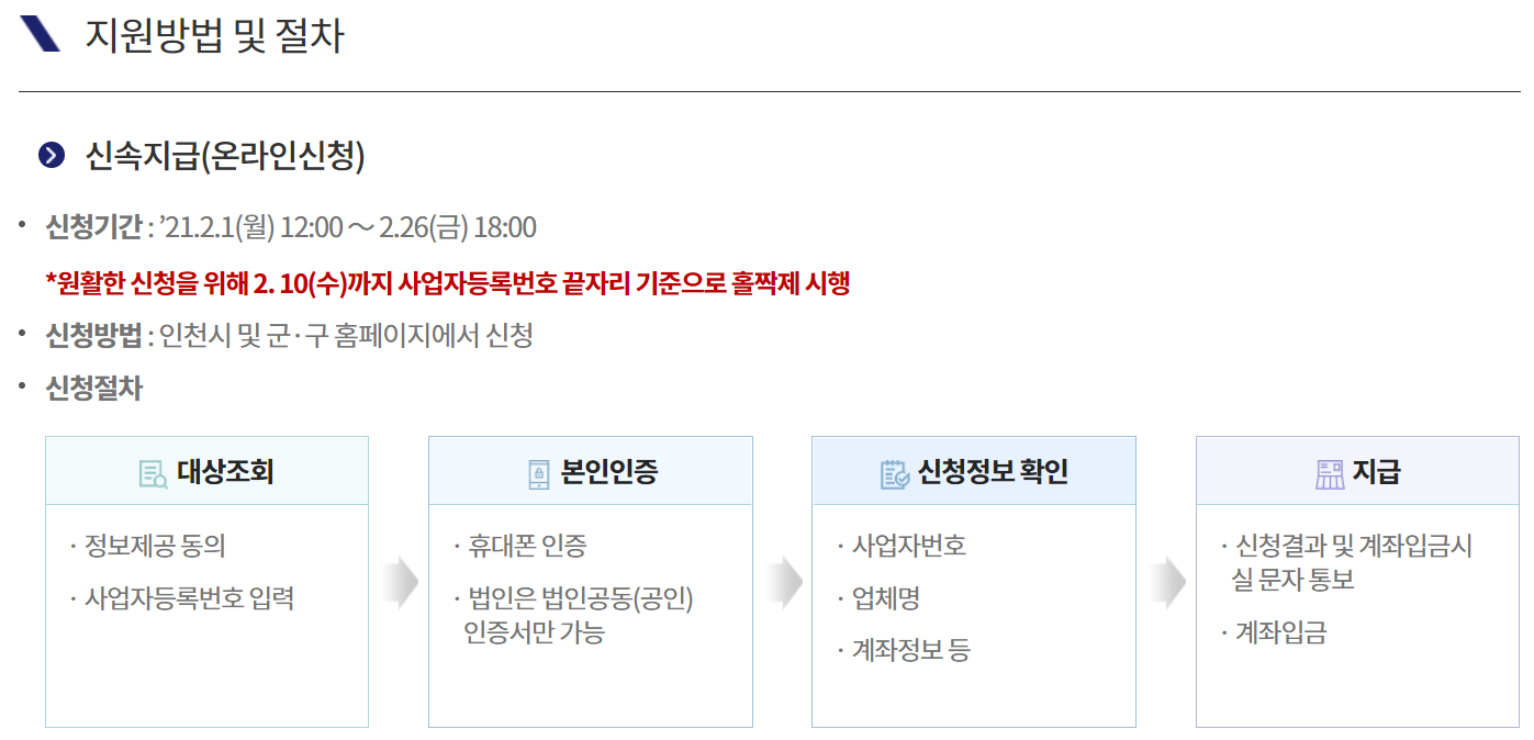 소상공인을 대상으로 지급하는 인천형 긴급재난지원금 온라인 신청은 21년 2월 1일부터 26일까지 신청할 수 있습니다.