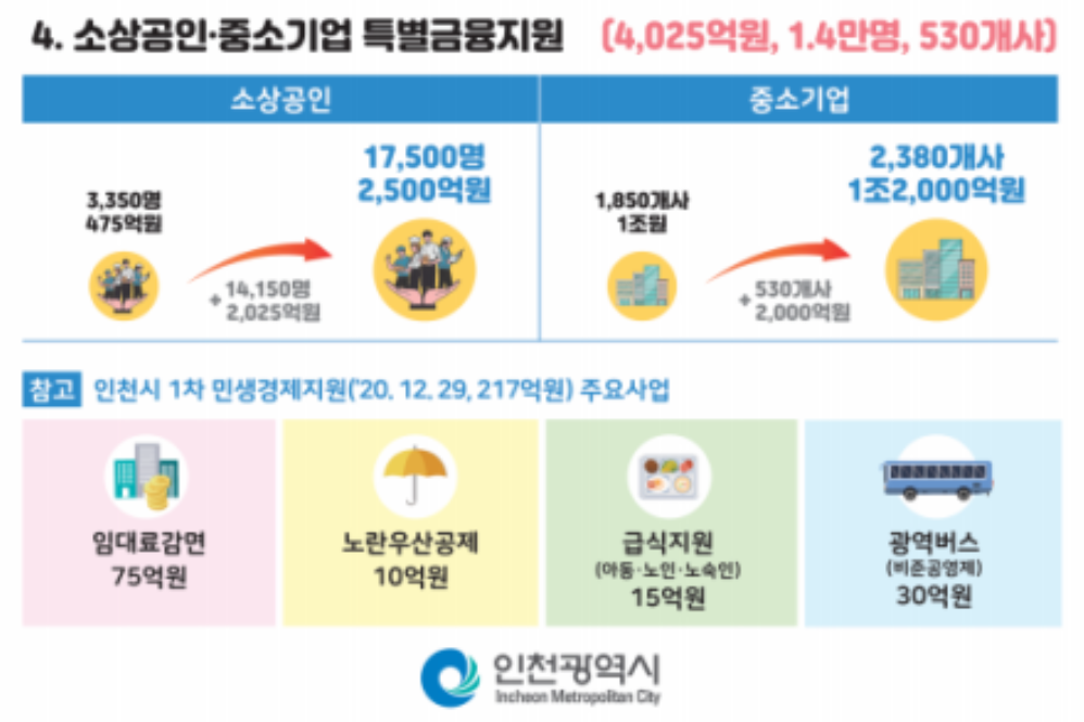 인천시는 코로나19로 어려움을 겪는 집합 금지·집한 제한 소상공인을 대상으로 정부의 3차 재난지원금에 추가로 지원하는 인천형 긴급재난지원금을 지급한다고 밝혔습니다.