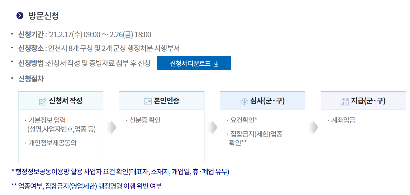 ⓒ인천광역시 오프라인 신청은 2월 17일 ~ 26일까지 사업장 소재지 군·구를 방문해 현장접수도 가능합니다.