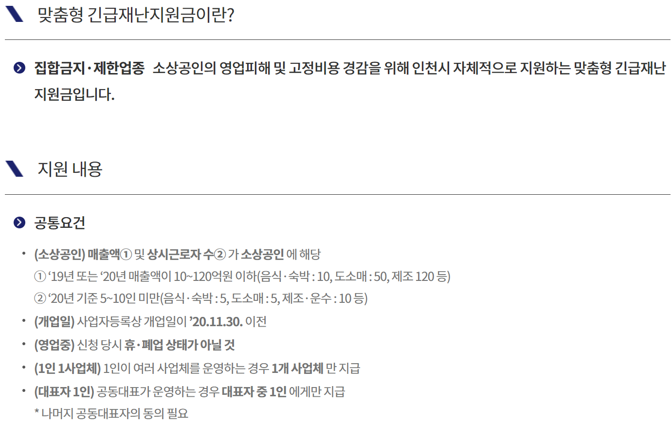 ① ‘19년 또는 ‘20년 매출액이 10~120억원 이하(음식·숙박 : 10, 도소매 : 50, 제조 120 등)