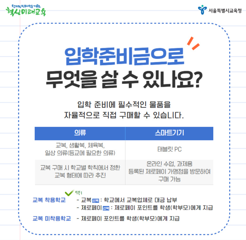 입학준비금으로 구입할 수 있는 물품은 교복, 생활복, 체육복, 일상 의류(등교에 필요한 의류), 원격수업에 필요한 스마트기기로 제한됩니다.