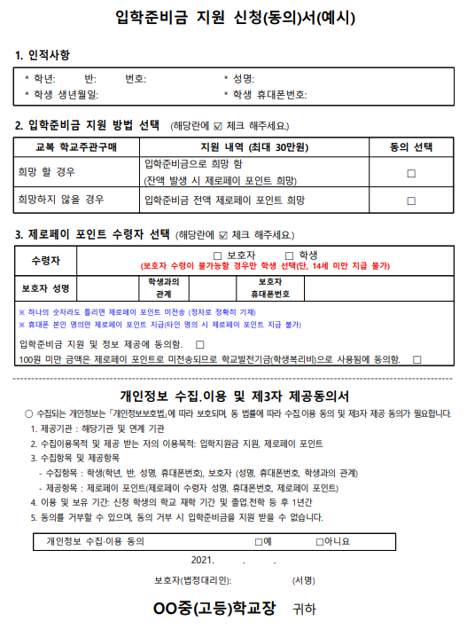 신청서 양식은 입학하는 학교에서 일괄 가정통신문으로 안내가 되었을 텐데 원하는 방식으로 신청하면 됩니다.