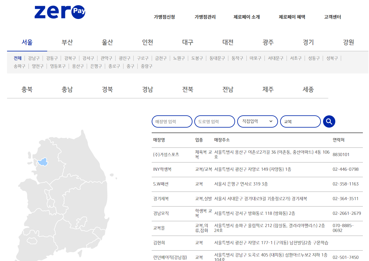 제로페이 홈페이지 가맹점 찾기 화면 원하는 물건의 키워드를 검색하여 찾거나, 자주 이용하는 매장의 이름을 통해 검색할 수도 있습니다.