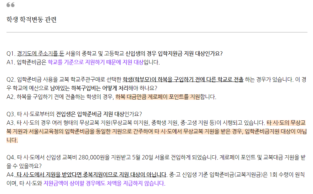 이럴 경우에는 종전 타시도 학교에서 입학하면서 무상교복을 지원받았다면 서울시 입학준비금과 동일한 성격의 복지혜택을 받은 것으로 간주되어 대상자가 안됩니다.